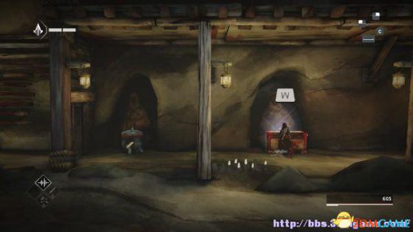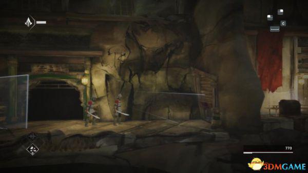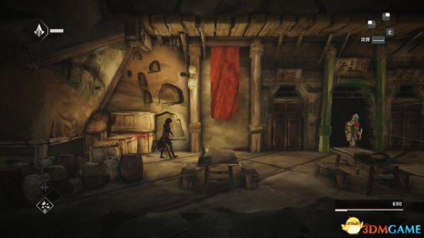 先借助连接远方的独木桥前往一尊佛像下方。然后落到下层的房间躲藏处,而右侧有两名在对话的守卫,两人很快就会对话结束,然后背身往左右两侧巡逻,少芸趁机可以落到在房间躲藏处右侧地面的匿藏处下方的平台。