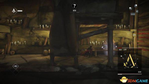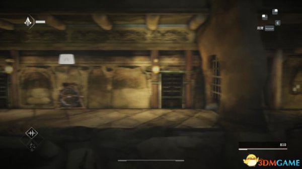 step14.此时要引入第四种暗器--风鸣镖,按4键往稻草堆右侧瞄准(按F键再移动鼠标),然后按G键投掷出去,那么在稻草堆旁的守卫就会忘风鸣镖跌落位置去查看究竟,此时少芸就可以钻进草堆内。然后再往草堆左侧投掷一个风鸣镖,当守卫往草堆左侧走去后,少芸就可以爬上右侧的楼梯。