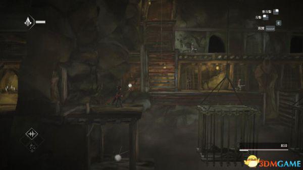 然后通过四个垂吊牢笼的顶部跳到右端,借助右端的独木桥前往远方的三层监狱。