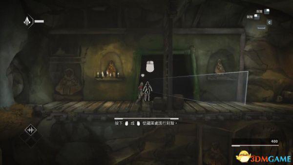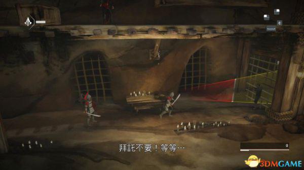 此时进入到右侧的第二个匿藏处内,右侧就只剩下黄金甲守卫,他非常警惕,要确保他的身躯是完全转到右侧,才从后暗杀他(他有时只会扭头观察,所以不能够一味就只观察他的视野)。