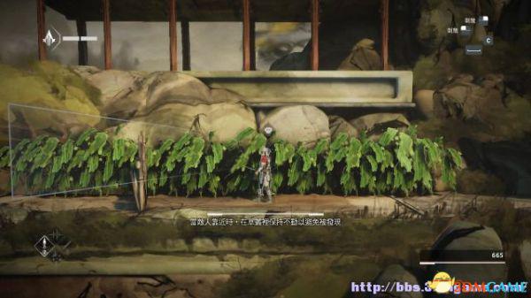 step16.这层有三簇草丛,而右端的草丛旁会有一名不时回头往左望的士兵,使用快速转移,去到右端的草丛中,然后落到地面边缘的横梁再往右侧爬去。