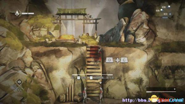 step2.草堆前方有一个梯子通往下方,梯子底部有两名正在对话的守卫(只是在说着互相照看的事情),此时按D键+空格键,少芸就可以从梯子上甩到两名士兵的右侧,并且不被发现。