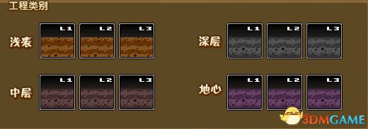 首先、我们按官方的分法,把整个矿区按深度分为4块区域:浅表区(0~35米)、中层区(35~60米)、深层区(60~120米)、地心区(120~250米),那个,再往下到300米就是极限了,不多说。