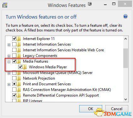 4、在出现的窗口中,找到“Media Feature”,在子菜单中确保Windows Media Player这一项是勾取了的。