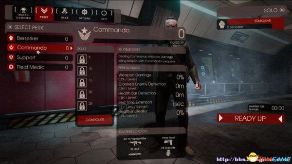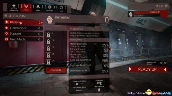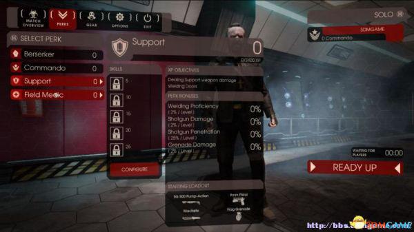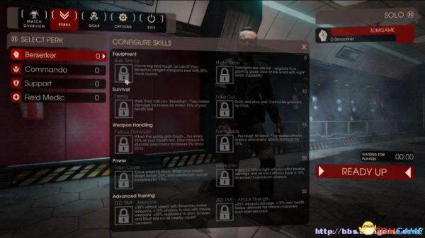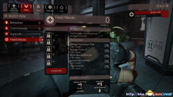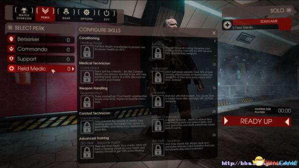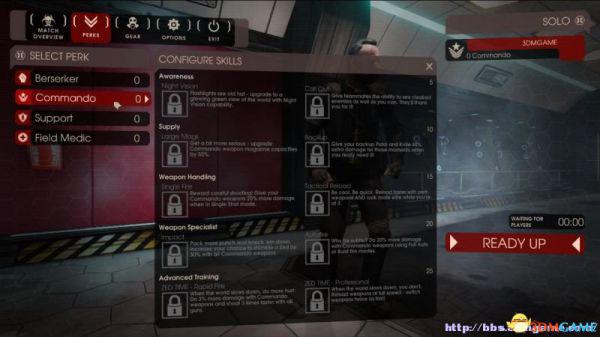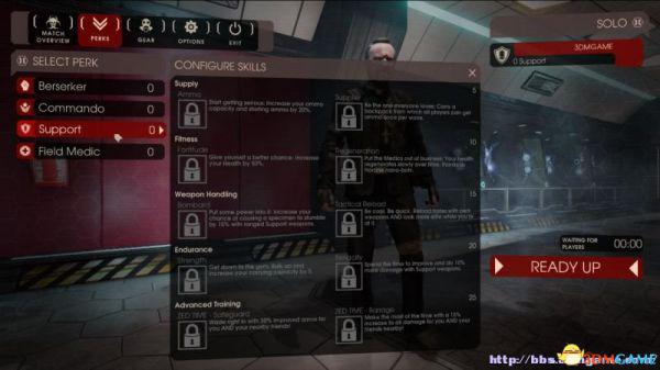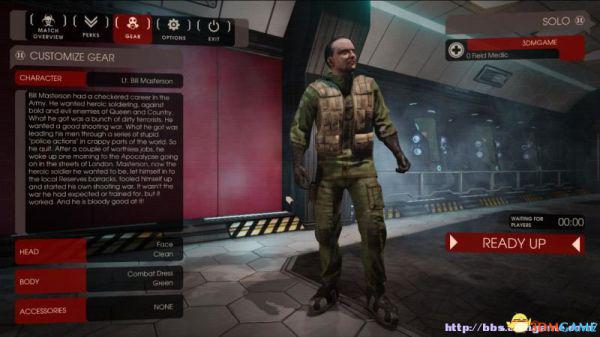 特殊能力:查看四个职业(狂战士、突击队员、志愿兵、医疗兵)的能力、查看他们获得经验的途径(如医疗兵可以通过治疗队友来获得XP)、查看等级增益表(每增长一级都会对不同的职业的技能提升效果)以及查看登场时的武器配备。
