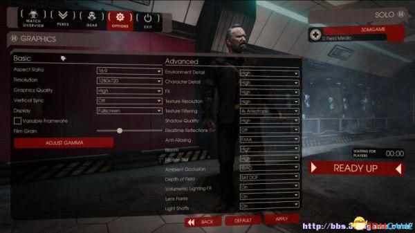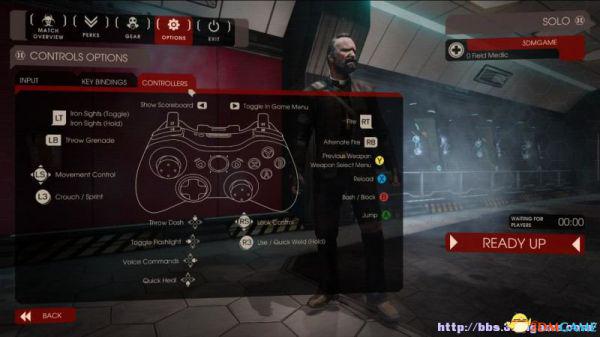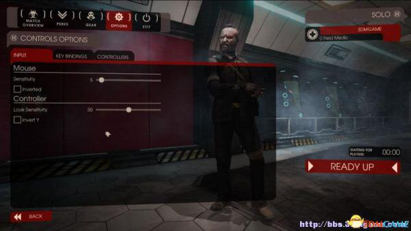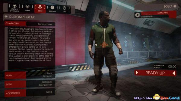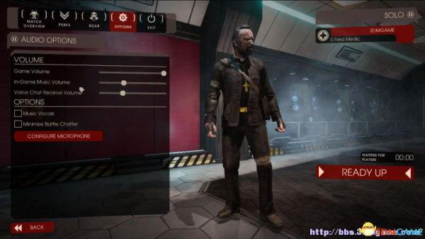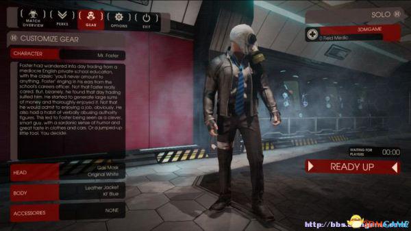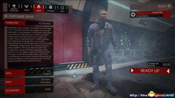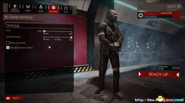 游戏首页菜单处于初始界面的顶部左侧,分别是竞赛概览(match overview)、特殊能力(perks)、装备(gear)、设置(options)和离开游戏(exit)。