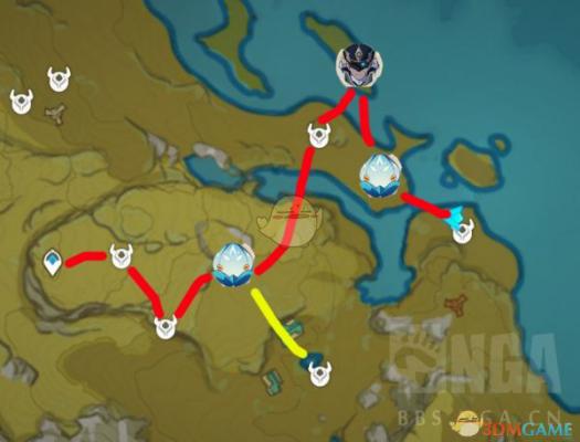路线如图,标记的都是丘丘人,四个营地加黄线连接的两个巡逻怪,总共7+4+4+4+2=21个,其中3个萨满,1个岩盔王