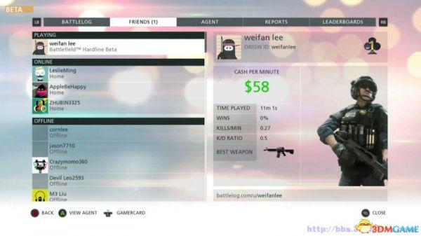 选择一名好友可以查看到他/她是否有进行《战地:硬仗》以及他/她的战斗数据(包括等级、每分钟抢钱金额、进行游戏总时长、胜率、每分钟击杀数、KD杀死比)、擅长使用的武器。