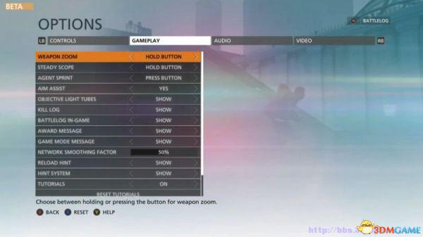 在游戏设置菜单之中按B键返回到上一页、按X键重置游戏设置、按Y键打开live、PSN的游戏帮助(目前beta版暂未有获得游戏帮助的服务)。