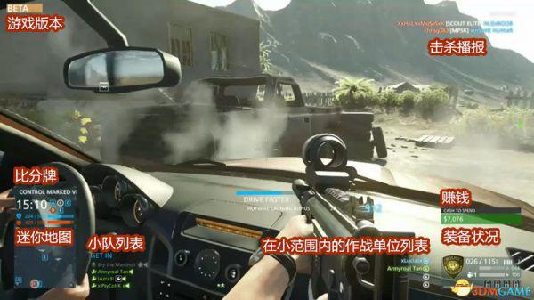 比分牌:(屏幕左下角)比分牌记录了敌我双方的分数、比赛所剩时间、据点(载具)占领情况。