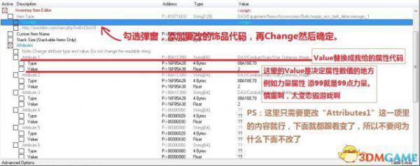 *最简单的技能戒指之间的的替换,这个只需要勾选“Inventory Item Editor”后,装备再卸下要替换掉的技能戒指让CE锁定它,然后替换成目标代码确定后,F5 F9就行了。