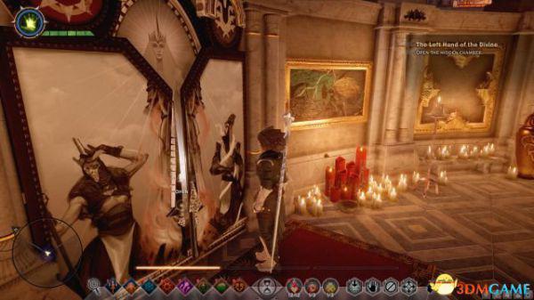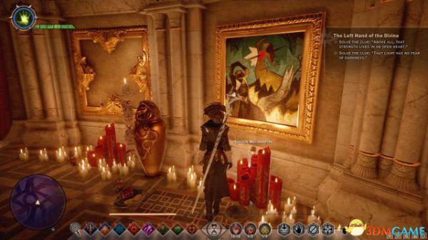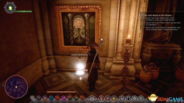 教皇留给莉莉安的字条似乎是加密的,现在审判官必须要找到三个机关,它们分别是:大厅左下角墙上像一朵玫瑰花一样画像下的机关;