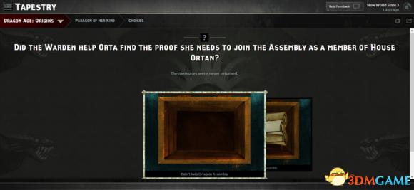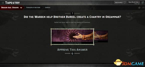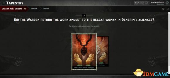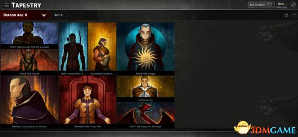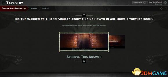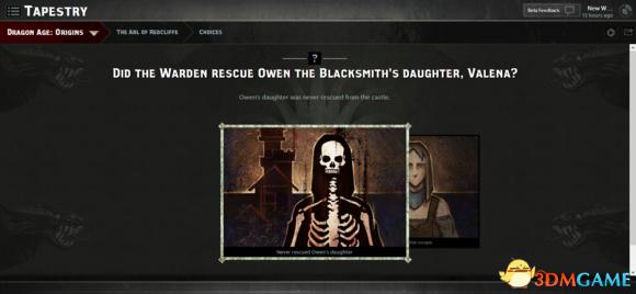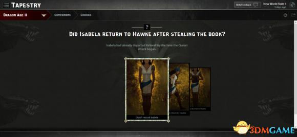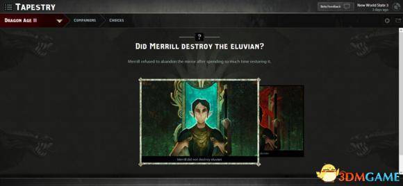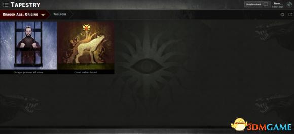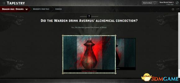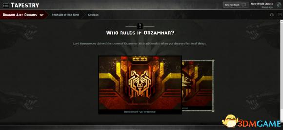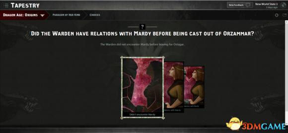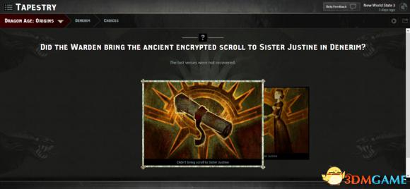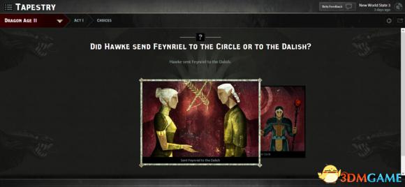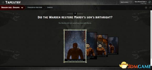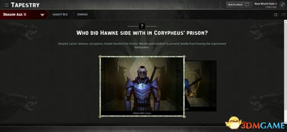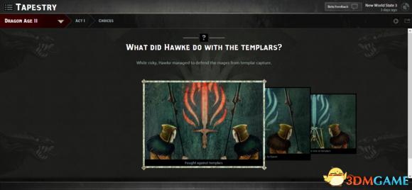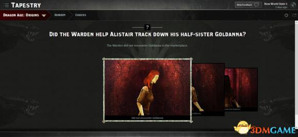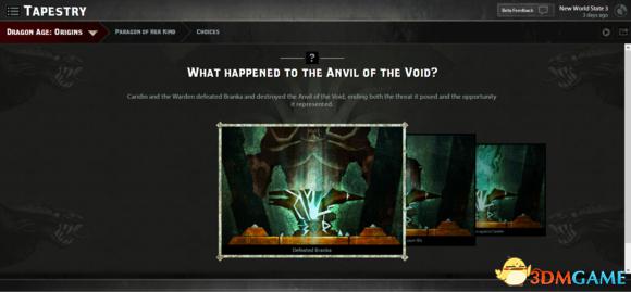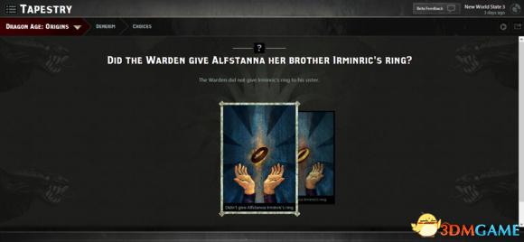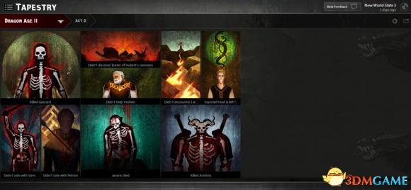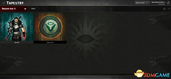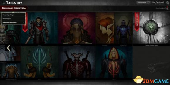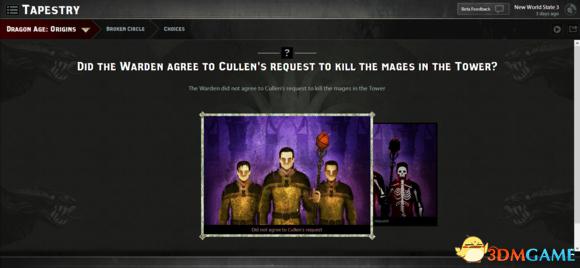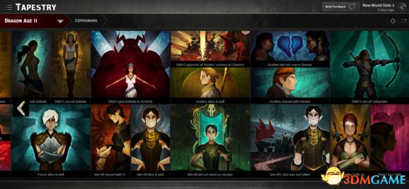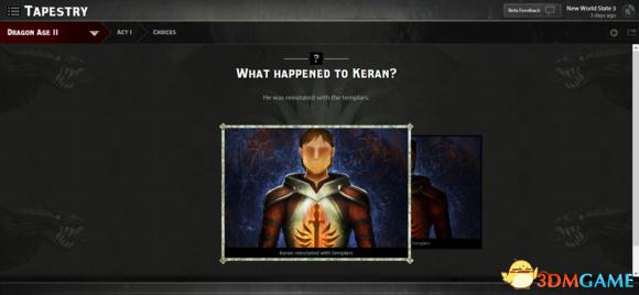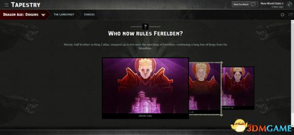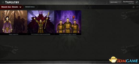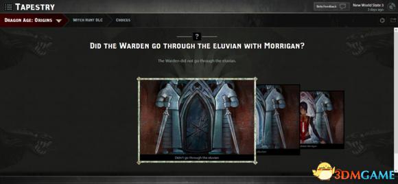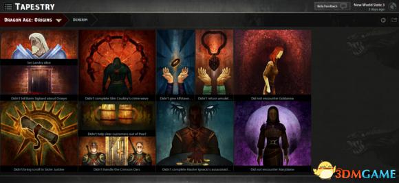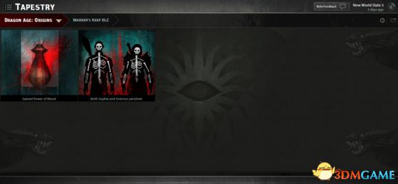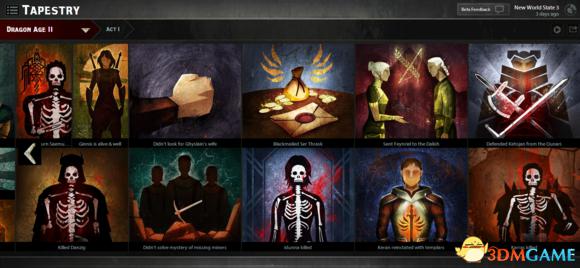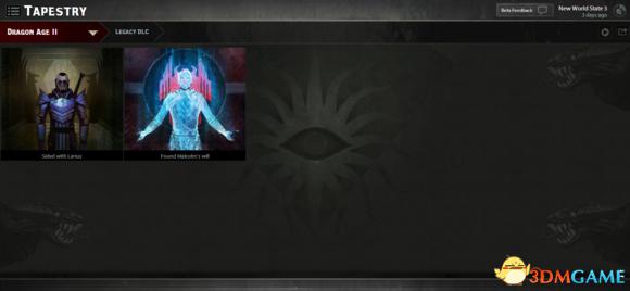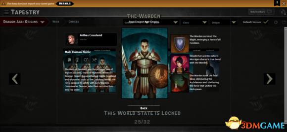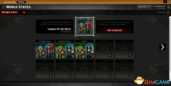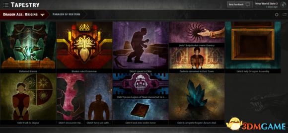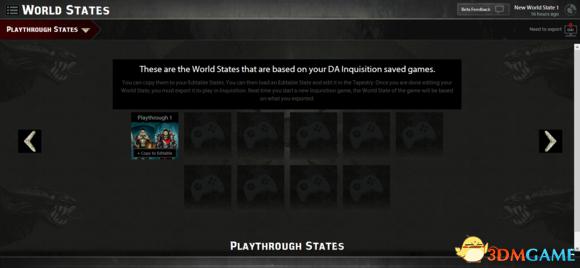 点击右边的箭头进入下一栏,或者点左上所示的按钮来切换。第一栏editable(也就是上图所示)是你可编辑的世界,这是关于DAO和DA2的历史;第二栏playthrough(下图)是你玩DAI所选择的世界,是不能改动的,你可以点击方块下面的copy to editable将它复制到第一栏中。图中可见我玩DAI的存档所在的世界。