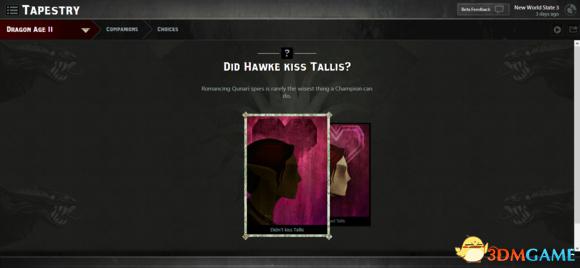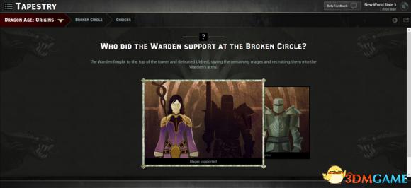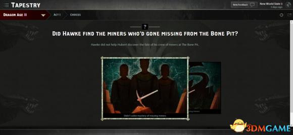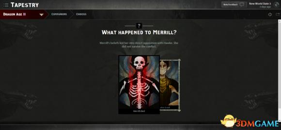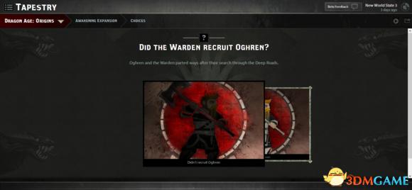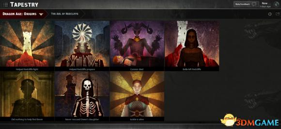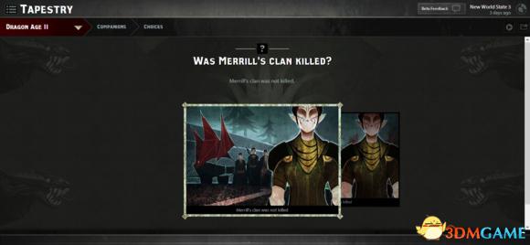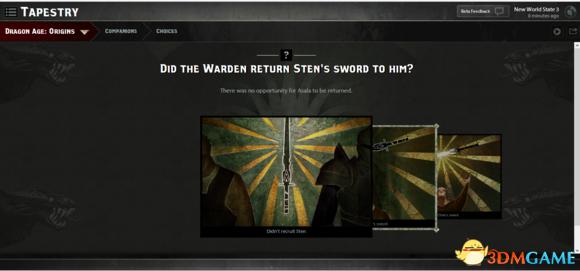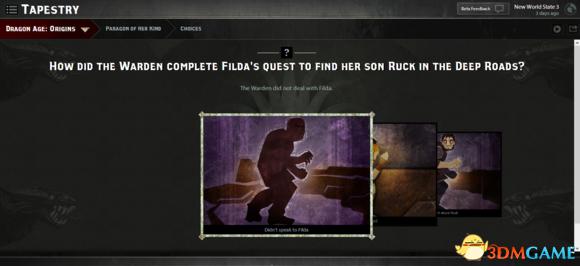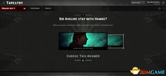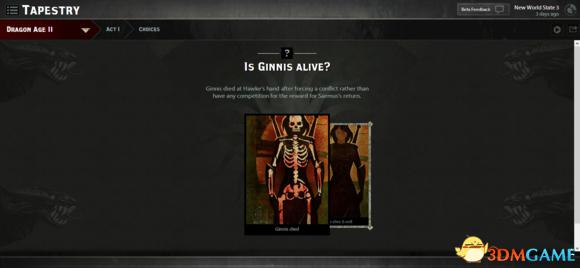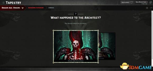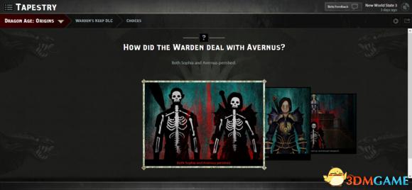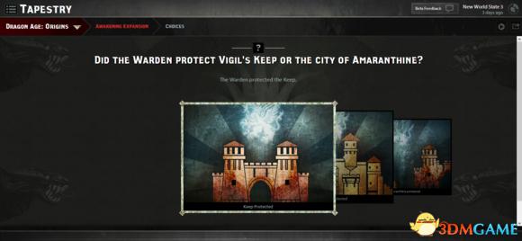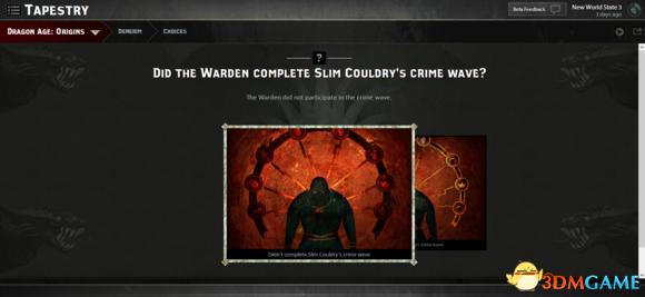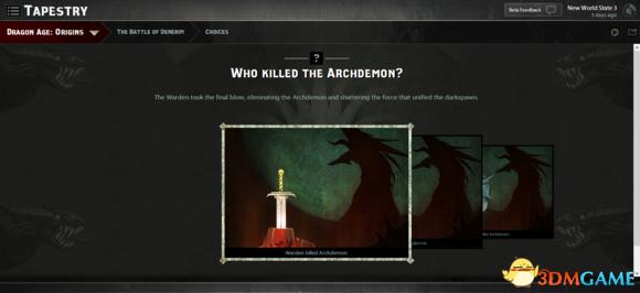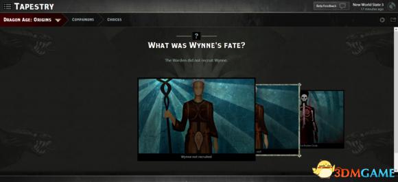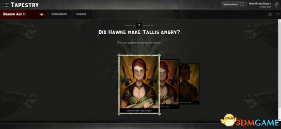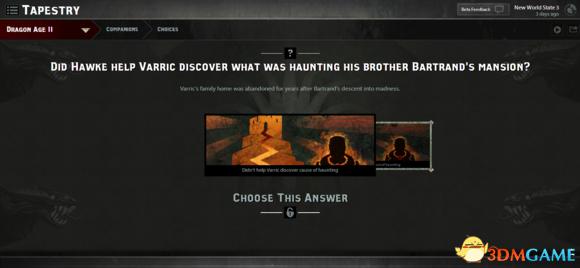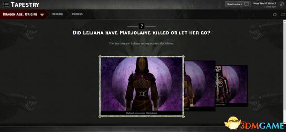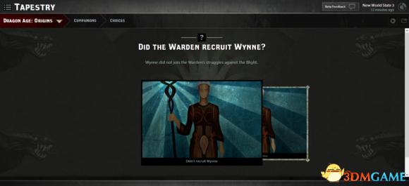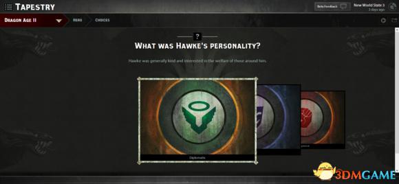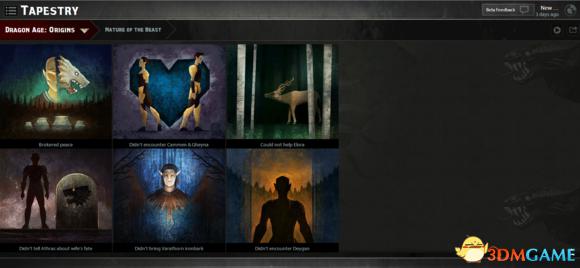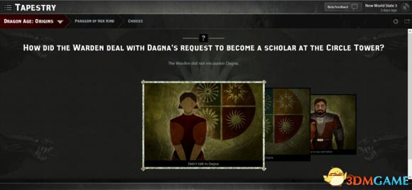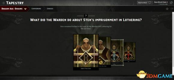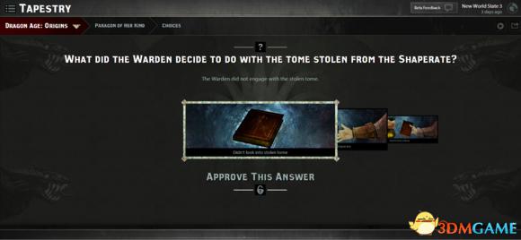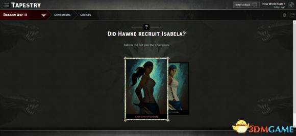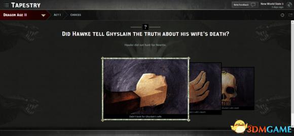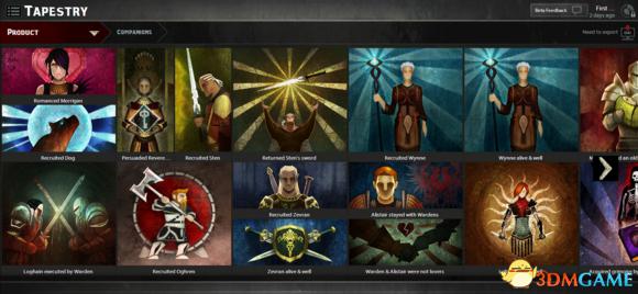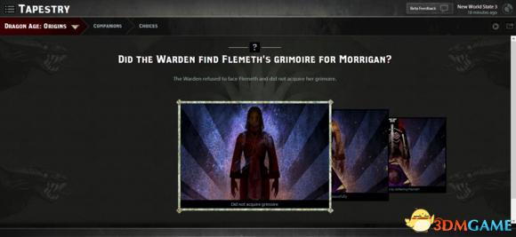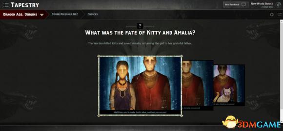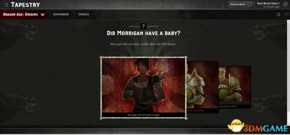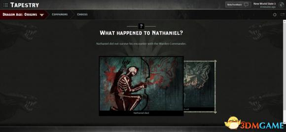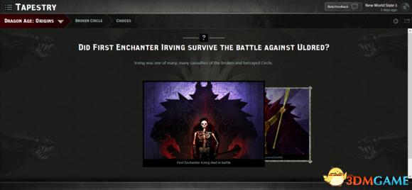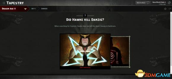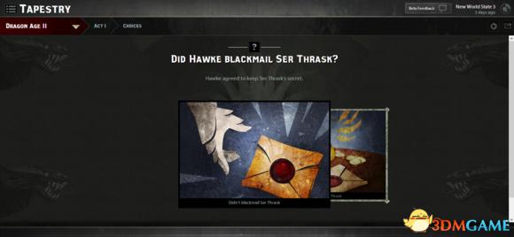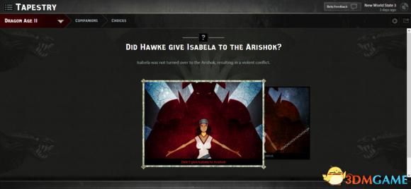 点击右边的箭头进入下一栏,或者点左上所示的按钮来切换。第一栏editable(也就是上图所示)是你可编辑的世界,这是关于DAO和DA2的历史;第二栏playthrough(下图)是你玩DAI所选择的世界,是不能改动的,你可以点击方块下面的copy to editable将它复制到第一栏中。图中可见我玩DAI的存档所在的世界。