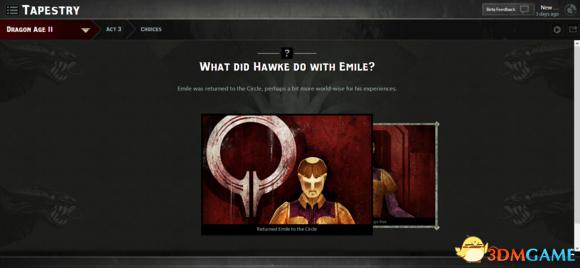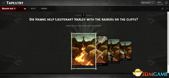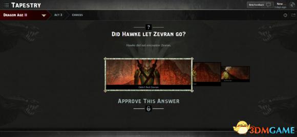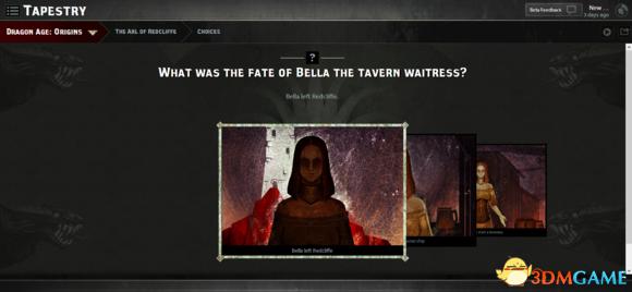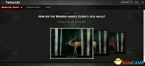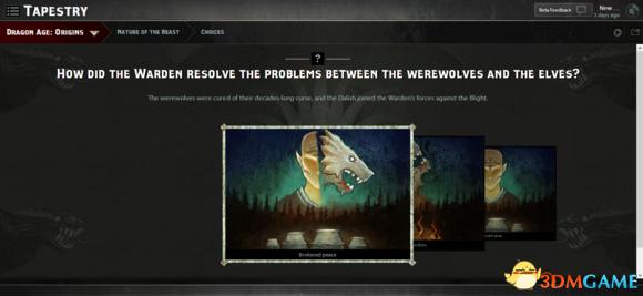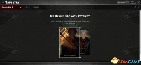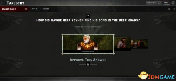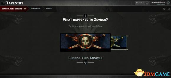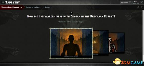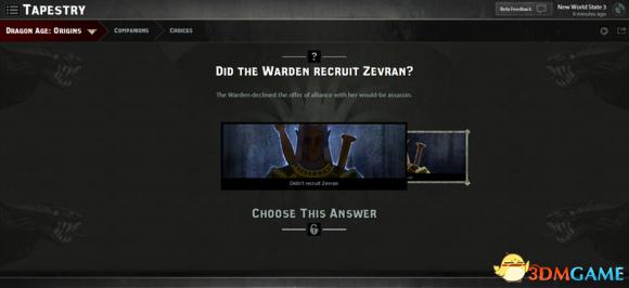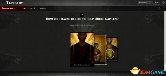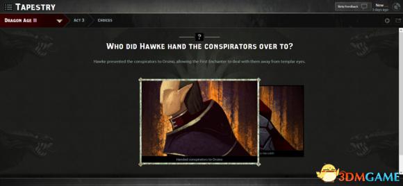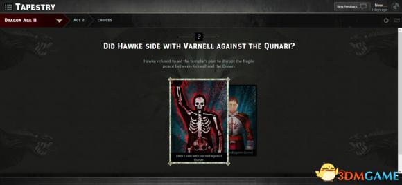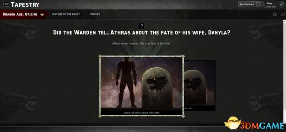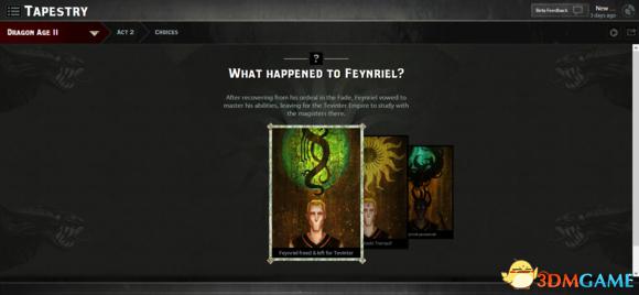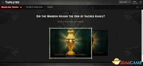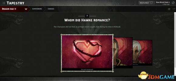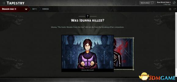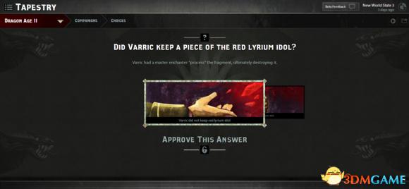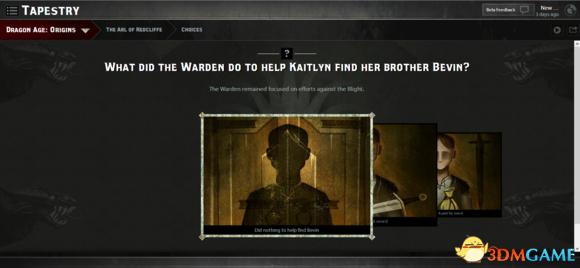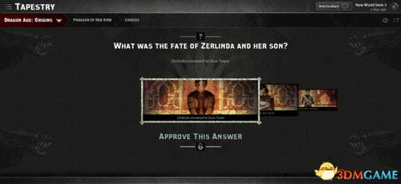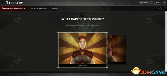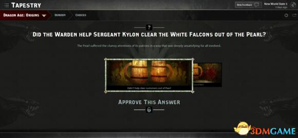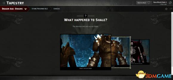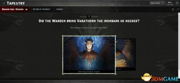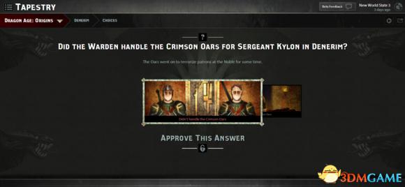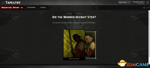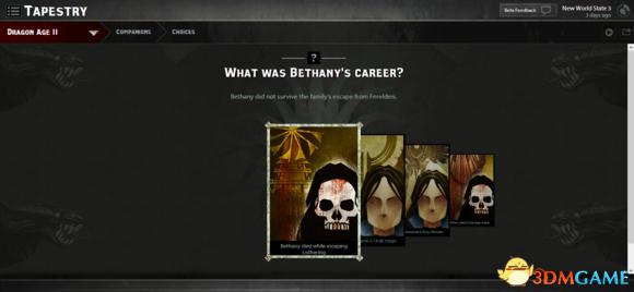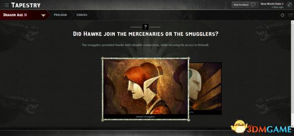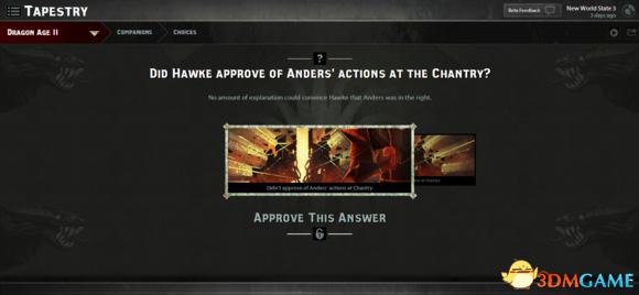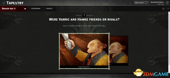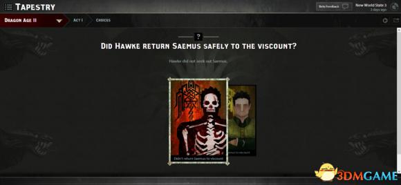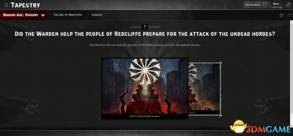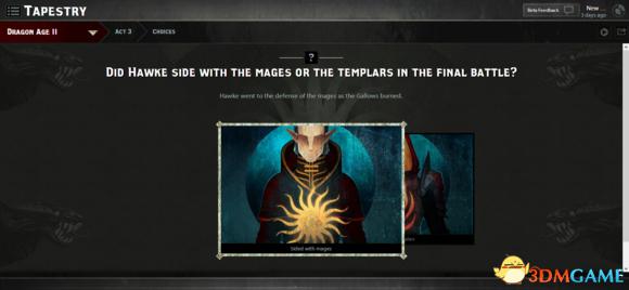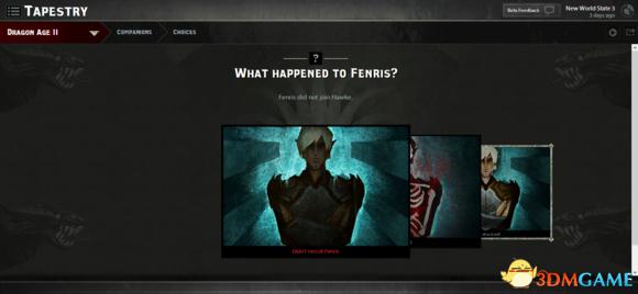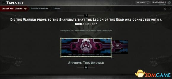 点击右边的箭头进入下一栏,或者点左上所示的按钮来切换。第一栏editable(也就是上图所示)是你可编辑的世界,这是关于DAO和DA2的历史;第二栏playthrough(下图)是你玩DAI所选择的世界,是不能改动的,你可以点击方块下面的copy to editable将它复制到第一栏中。图中可见我玩DAI的存档所在的世界。