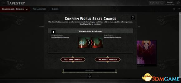 这表明这一件事的改动结果和杀大恶魔人选冲突,因为洛根存活和阿历斯泰独自当王不能共存。点Yes会确认本次改动,同时将与之冲突的事件按照图中所示也一并改动;点No则取消改动。