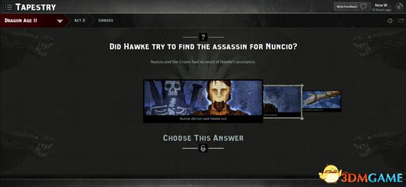 第一项,是否帮努西奥寻找刺客。从安提瓦来的努西奥请你帮忙追捕一个刺客。该刺客其实是起源里的泽弗兰,只有他存活你才能接到这个任务。(实际游戏中由于存档判定有问题,所以有可能在泽弗兰死的情况下也接到任务。)