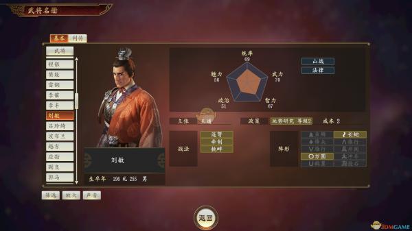 评价:207在零陵……没错,假如玩刘度,蒋琬,刘巴,赖恭都跑了,撑几年你还有个刘敏,207之后好像在成都,不弱的,就是统率偏低,但是山战这种好东西,带3000兵,一般跑到建安上面做个军乐台劫几年粮,随便都可以80+统率……