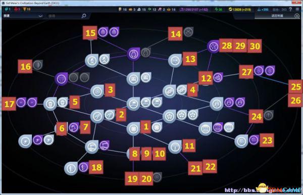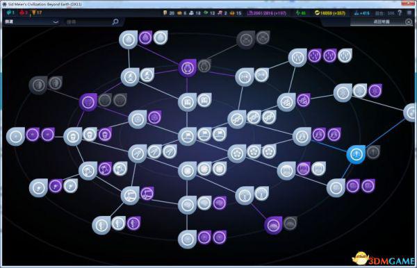在《文明:太空》中,科技研发列表不再采取之前文明作品中的树型结构,而是采用了类似“无尽空间”中的网状枝节形态。