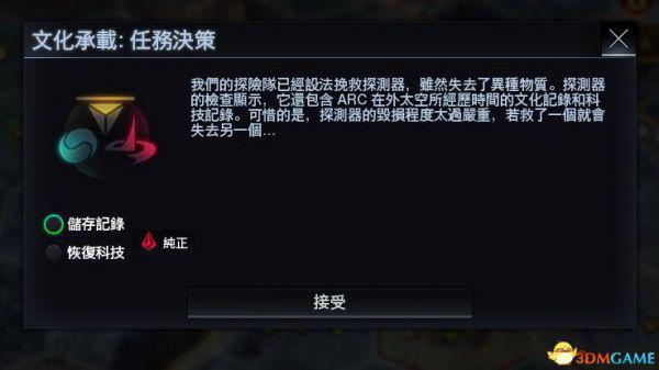 等待若干回合后,考察结束,地图右下角会有【任务决策】提示。点开,这里有俩种选项,不留下污染(和谐)/恢复探测器(至高)(纯正)。