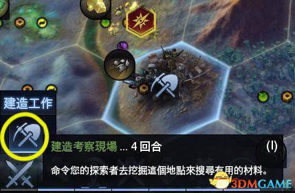 当探索者在可探索单元格附近时,该单元格会显现一个【铲子】的提示,移动到该单元格,点击铲子按钮开始科考工作。