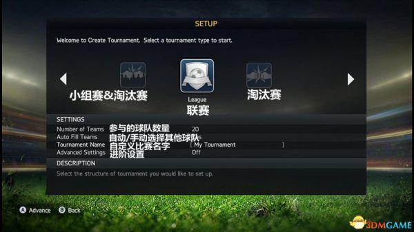 自定义模式总共有3大赛制,联赛(最多20支队,如英超、西甲)、小组赛&淘汰赛(最多32支队,如世界杯)、淘汰赛(最多32支队,如世俱杯)。