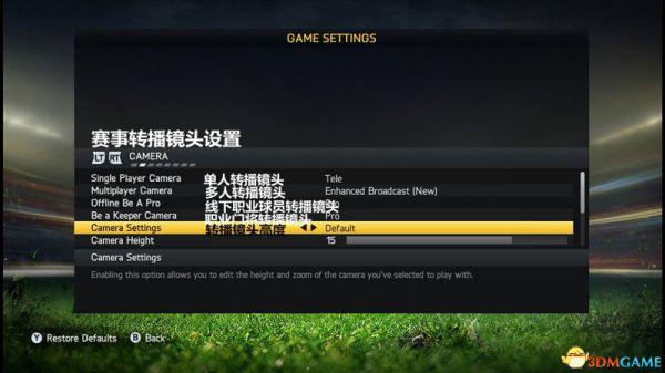 转播镜头高度:编辑转播镜头的高度(最高是20,最低是0)、焦距(最高是20,最低是0)、专业镜头速度(最高是20,最低是0)、镜头摇晃度(最高是20,最低是0);