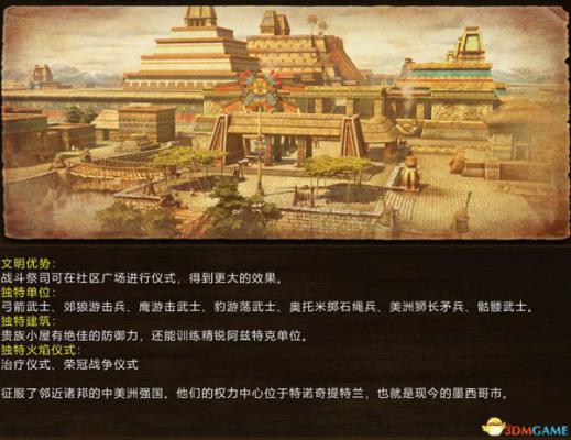 阿兹特克是唯一一个纯步兵民族,但步兵种类丰富,既可强经济又可强军事,战术多样性不逊于任何一个国家。阿兹特克既能凭借前期实用的土狼游击兵、投石兵以及性价比超群的美洲狮长枪兵发动致命快攻,又能通过火舞生产10个战斗祭祀,从而在不影响正常经济发展的情况下就拥有相当于另两个土著20农跳舞的各项加成。后期阿兹特克的弓箭武士、雄鹰游击武士和美洲虎徘徊武士同样性价比不俗,而稀有却强大的骷髅武士的攻击力更是惊艳,打卡后范围攻击高达3格,近身作战威力强大。阿兹特克的农业科技发达,拥有一系列农田生产速度加强。此外阿兹特克的海战实力同样强大,拥有性价比极高的雨神独木舟,虽然射箭但威力却比欧洲的炮舰更惊人,是游戏中最强的海战民族之一。
