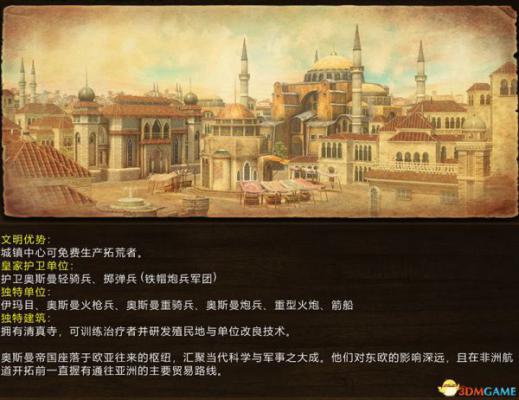 奥斯曼土耳其帝国也译为土耳其人,夹在亚欧大陆之间的伊斯兰国家,在工业国家崛起前是让欧洲人让闻风丧胆的帝国。土耳其人免费制造村民节省大量食物,使得前中期的快攻威力大。土耳其人的军事自成体系,拥有一系列土耳其特色兵种。苏丹亲兵是土耳其人唯一的但却是血高近战高的火枪手;奥斯曼轻炮兵类似欧洲散兵虽然血薄防低却拥有无视防御攻击,对各种步兵均构成强大杀伤。土耳其人能从主城运送欧洲各国中间最强大的奥斯曼重骑兵,并能生产威力惊人的超重量武器,重型火炮以取代工厂的重型加农炮。