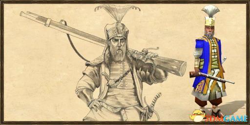 详解:鄂图曼(奥斯曼)火枪兵是鄂图曼人独有的步兵单位,他们的生命值、攻击力和射程俱佳,他们与火枪兵相似,不过成本较高、火力较强。他们在近身战斗时,使用土耳其短弯刀,而不是刺刀来攻击敌人,因此对骑兵的杀伤力较低。鄂图曼火枪兵的成本昂贵,但对单一个人口数的成本而言是相当值得的。