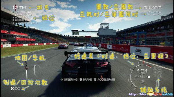 左上角显示为比赛的排名以及车手的位置;右上方为圈数以及比赛用时;左下角为地图;右下方为转速表、时速表。