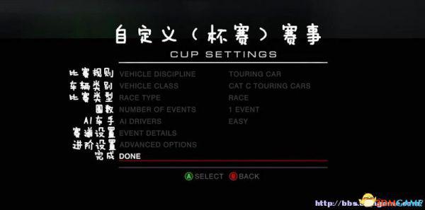自定义(杯赛)赛事,允许玩家自主定义比赛规则、车辆类别、比赛类型、圈数、AI对手难度、赛道设置、进阶设置。