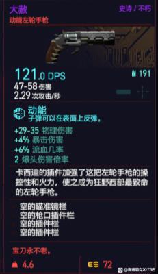 《赛博朋克2077》中的不朽武器大赦是非常强力的动能左轮手枪,单从威力上看还是称得上手炮的,获得方法是帕南支线抢坦克之前在篝火旁(应该没记错)和老警长玩打瓶子游戏15秒打掉12个获得。