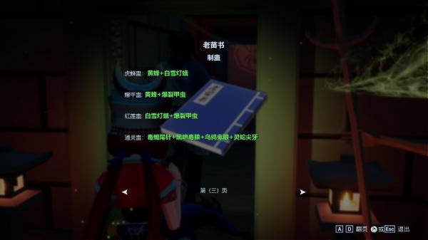 在母亲的笔记“老苗书”中可以看到“养蛊”“制蛊”“制器”“下蛊”的方法及苗药的特点介绍。这些内容均是游戏内最基础最重要的信息,需仔细研读。如忘记可随时在游戏内按“N”键查看。但由于书籍破损,只有部分内容可以查看,部分页面缺失。