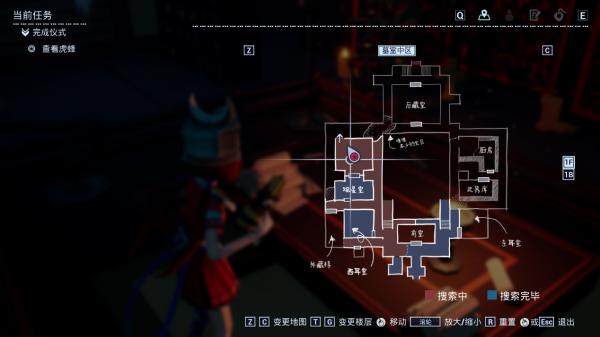 地图中黑色的区域代表还没有去探索过。红色代表探索过,但还有未发现的物品。如果某区域变为蓝色,说明该区域已经被完全搜索完毕,已获得所有物品。整层墓室房间很多,物品也有不少,可多转转探索一下,收集更多的资源。