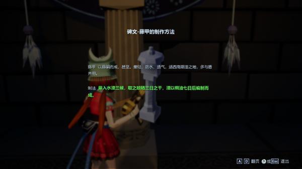 从绿色字体提示得知藤甲的制作方法为,先用水泡,再晒太阳,最后用油浸泡,这样才能制造成功。三次转动的图案需按照此提示来进行。