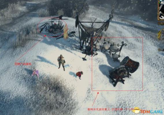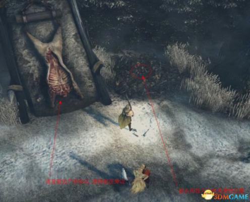 这是一个到处有巨人的场所,地图很显眼的位置有一个绑有类似狼的尸体的石头,令我们头痛的无以复加的遗物就藏在它旁边的遗骸上。