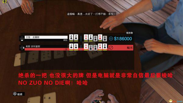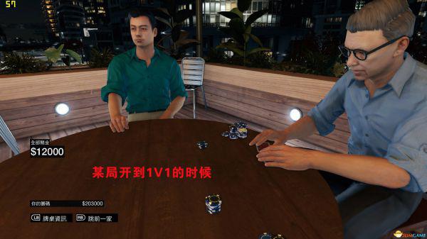 一旦机会来了,不要一口气把赌注提太高,分几次慢慢提,千万别把对方给吓跑了,要给他机会让他把钱放上赌桌,你才能赢过来。最后一次加注可以视情况梭哈,往往某个NPC就是在这样的一两次对赌被你赶下台子的。