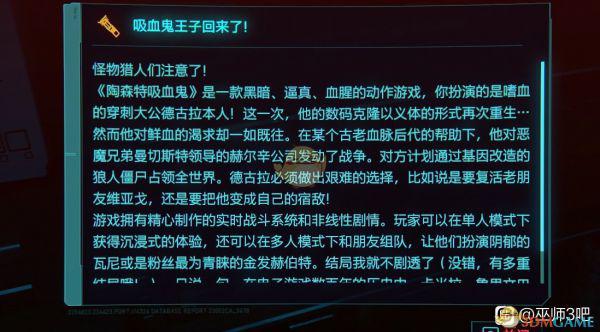《赛博朋克2077》中是有很多关于《巫师3》的彩蛋的,血与酒的陶森特吸血鬼就是其中一个,在2077年陶森特吸血鬼被做成了一款游戏,你扮演的是嗜血的穿刺大公德古拉本人,具体内容如下图。