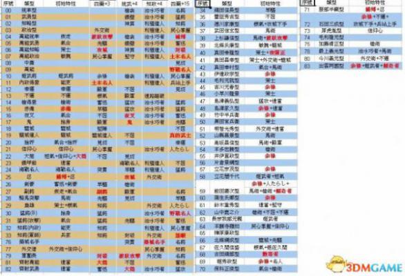 大家从这张图可以看出来序号34~70都是超强的特性武将,也是一般城主首选。但是大家会不会有时候觉得其他多的刚打下的新城没这么多人名型武将可以练,这边主要是推荐大家别忘了序号00~82裡面也是有很多好练的武将型适合当城主的。