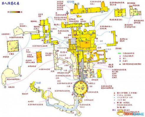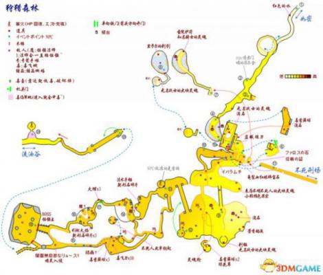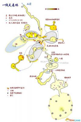 比如一线天森林~①就是你出生的地方、②是下一个场景,左方隐秘处有道具、③是老婆婆的房子、④是一个强力怪物,攻略路线可以按这个来。然后虚线啦、箭头啦、自己脑补出立体地图啦,就靠你自己了。