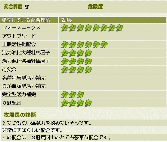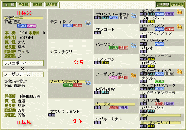 父母、母母这两个位置的马都是电脑马,父母的位置只要是パソロン系母马即可,(之所以选パソロン系母马主要是看中了パソロン的两个因子)。母母的位置可以在デスコボーイ系成立之后用配合工具搜索,寻找和デスコボーイ系构成三重相性的母马买入即可。