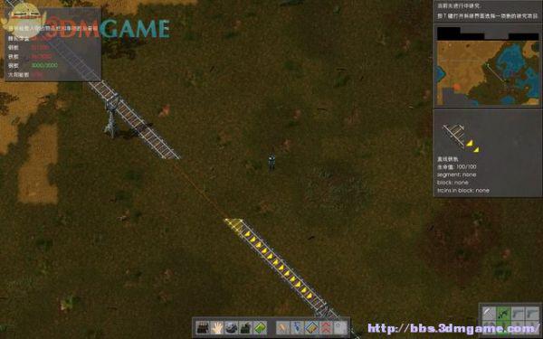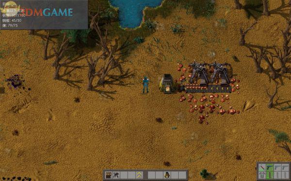 现在要调查东边的残骸,那边有两只小型沙虫和虫巢核心,小型沙虫会抛掷攻击,虫巢那里不断的有虫子朝主角攻击,所以不能贸然接近它们,而是在地上摆放炮塔并填装此前制造的棘轮弹盒,再用快捷栏里的新道具-石墙将它们保护起来,让它们自动清扫冲击过来的虫群,而主角不必忙于战斗,只是轻巧的奔跑躲闪就可以了。