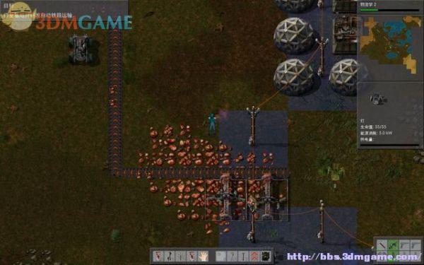 接下来造雷达,需要铁板和铜板,这就意味着要开采铁矿和铜矿,电能采掘机要比热能采掘机快得多。在附近的铁矿和铜矿上布置好生产线,再用电线杆将电力输送过去,给石炉加好煤,可以生产出铁板和铜板了。