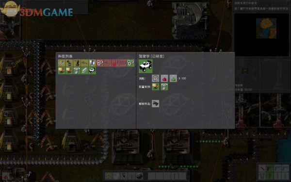 现在要研发“驾驶学”,需要一步步来解锁科技,按T键打开科研界面,先选择研发“物流学1”,依次解锁“驾驶学”所需要的前置科技。