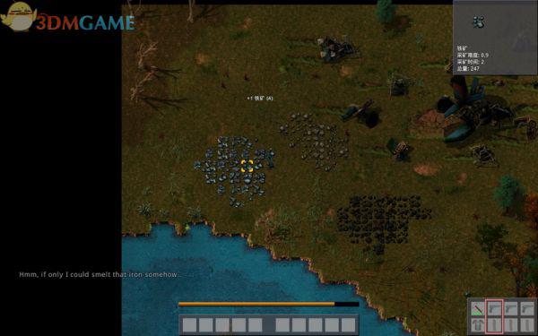 走近左边的一片铁矿,屏幕的右上角出现矿藏的说明:采矿名称、采矿难度、费时和总量,用斧头开采4份铁矿,再采一些石块,制作一座石炉。