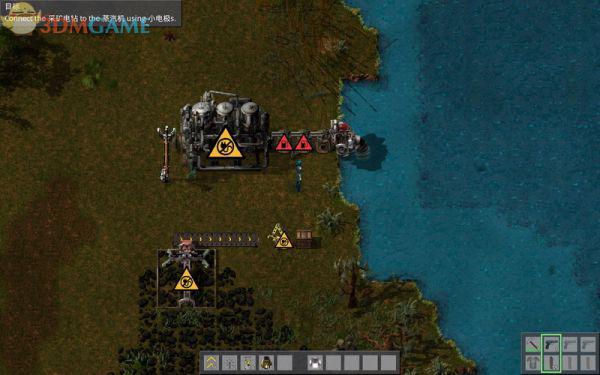 当务之急是恢复电力供给,由于有座太阳能发电厂,初期还是有少量的电力产出的,只是它不能维持大规模的生产线。现在走到湖边找到发电蒸汽机,将缺失的蒸汽机补上,然后将锅炉也补齐连接完整,现在还差燃料了。