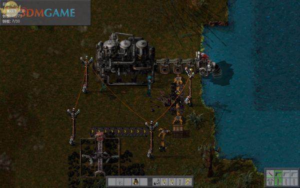 打开制作界面,看到可制造的东西多了起来,包括管道、锅炉、蒸汽机、路灯、供水泵、电路板、铜线、护甲等等。地上已经放好一部蒸汽机,现在制作一只供水泵,将它放到湖边,和蒸汽机设备连接起来。