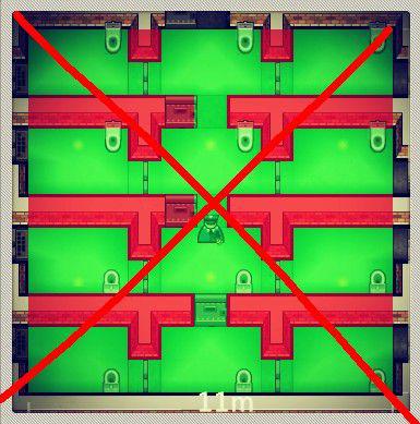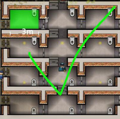 ①建造房间功能为“单独牢房”的房间,最小使用面积2X3,为了节约面积可以进行下面这种盖法