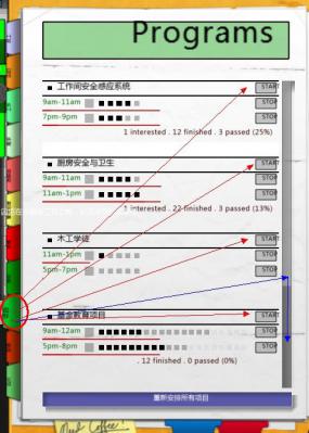 点击Start即可开始课程,同一个课程还能增加不同时间段,当然,要想错开不同时间段,开出更多课程,可以在上面的“管理制度”把“工作”时间段设计的间隔开且频繁一些,但是考虑到犯人途中切换手头忙活的事儿跑来跑去会占用不少时间,我个人还是推荐将时间段相对集中一些,一天分2、3次,同一课程开出2、3个课时即可。